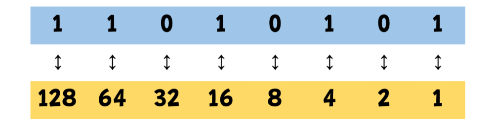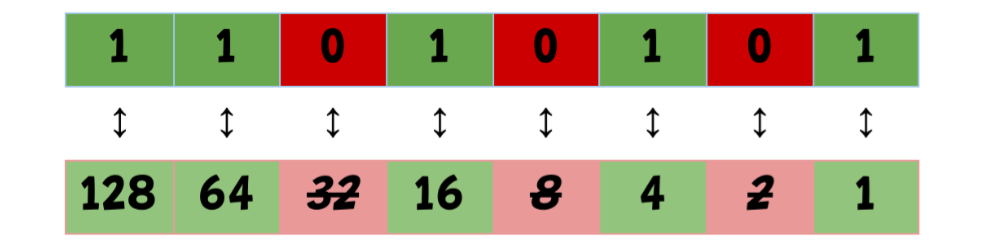 Knowing that the bits represent a positive value and a negative value, we can use this to read what the entire octet represents by adding what is “positive”, and ignoring what is “negative”.